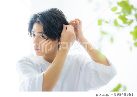 ヘアスタイルを整える若い日本人男性 美容 スキンケア メンズコスメ