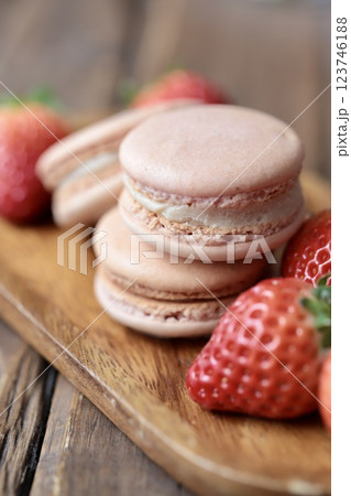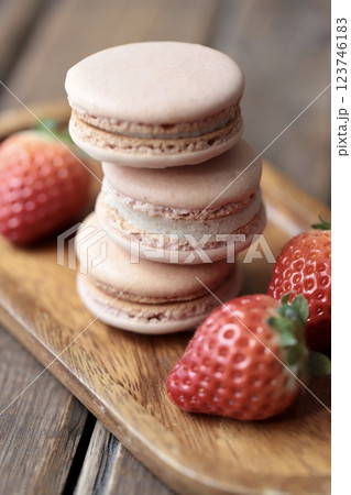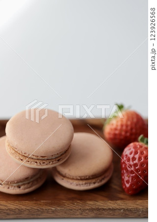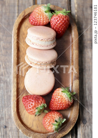木のお皿にのせたストロベリーマカロンとヘタ付のイチゴ