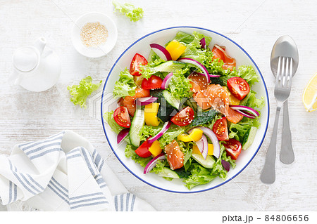 Salted salmon salad with fresh green lettuce, cucumbers, tomato, bell pepper and red onion. Ketogenic, keto or paleo diet lunch bowl. Top view