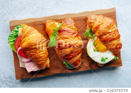 Croissant sandwich variety. Various stuffed croissants, overhead flat lay