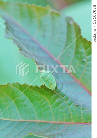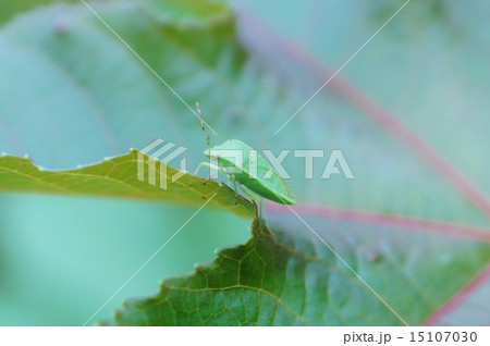 生きる緑の背景素材・トウゴマの葉に緑のカメムシ側面アップ・横位置