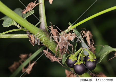 生き物 昆虫 ホオズキカメムシ、色々な作物に被害を与えます。オオイヌホオズキに群がる成虫の群れ
