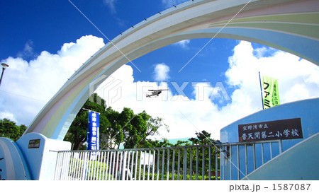 普天間第二小学校・幼稚園 正門と、軍用ヘリ