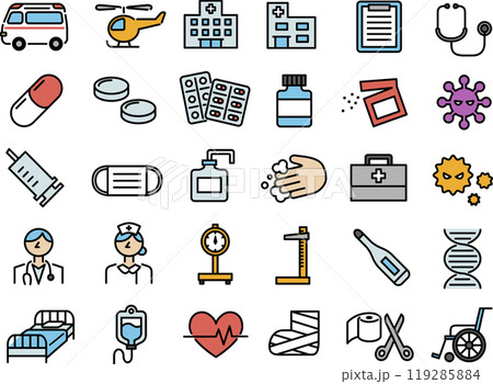 病院・薬など医療関係アイコンのイラストセット(カラー線画)