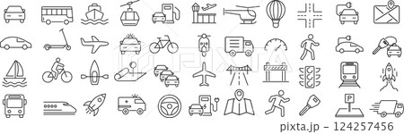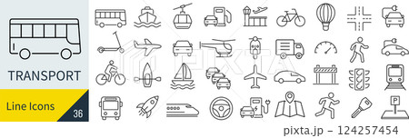 Transport line icons. Taxi, Helicopter and subway train icons. Truck car, Tram and Air balloon transport. Bike, Airport airplane and Ship, subway. Travel bus, ambulance car, paper airplane. Vector