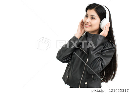 革ジャンを着てヘッドフォンで音楽を聞く若い女性