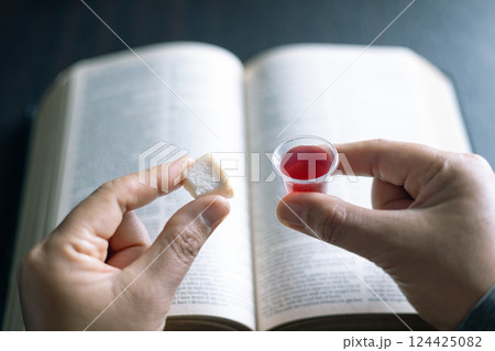 Holy Communion or Eucharist of christianity concept. Eucharist is sacrament instituted by Jesus. during last supper with disciples. Bread and wine is body and blood of Jesus Christ of Christians.