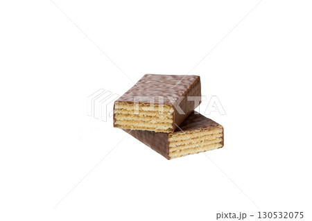 Sweet chocolate wafer broken into two pieces isolated on white background.
