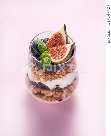 Delicious natural yogurt with granola, figs and berries in a glass on a pink background.