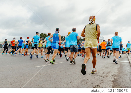 word Start on yellow line with blue sneaker or sport shoes on asphalt road background.