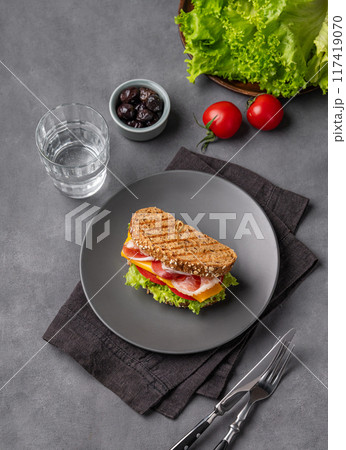 Club sandwich on a wooden plate of ham cheese, cucumber, tomato and lettuce leaves