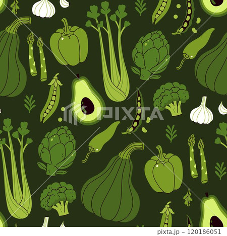 Seamless pattern with different types of green vegetables on a green background. Vector graphics.