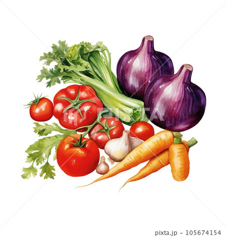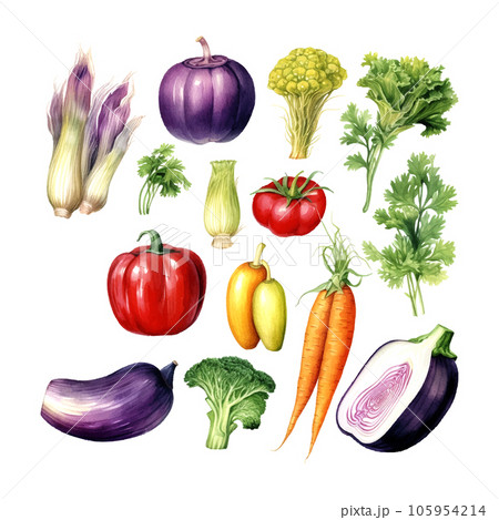 Vegetables watercolor in retro hand drawn style on white background. Summer element vector illustration.