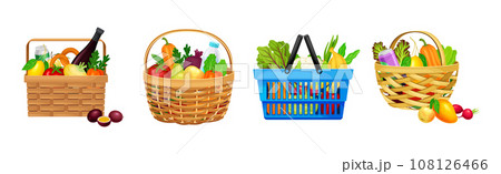 Shopping Wicker and Plastic Basket Full of Grocery Product and Purchase Vector Set