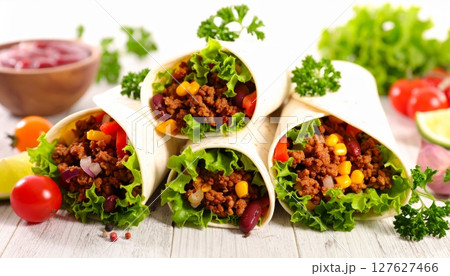 Street food filled tortilla pita gyros taco, sliced chili pepper lime, avocado nacho chips. Hand drawn ink vector isolated illustration. Seamless pattern for travel, restaurant bar menu, recipe book