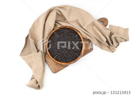 pile of black rice in a wooden bowl isolated on a white background.