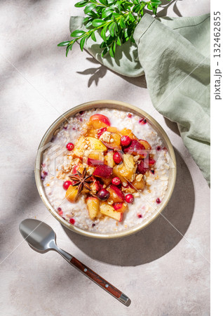 Overnight oatmeal with apple, cranberry and cinnamon in a bowl on a light background with spoon