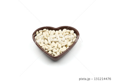 white kidney beans in a heart shaped bowl a on white background.Top view.