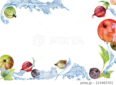Currant gooseberry flying in water splash with green leaves, dew drops, ripe garden berry juneberry casseille jostaberry hand drawn in watercolor. Isolated border corner frame. Menu, farmers market