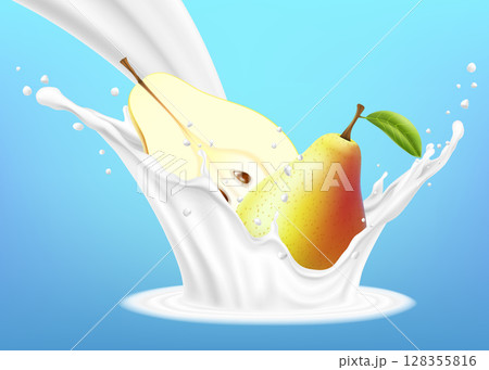 Realistic tropical whole and half sliced pear and splash of milk illustration isolated on blue background. Natural cosmetic, yogurt or fruit and milk cocktail vector concept.