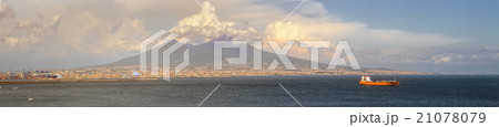 南欧イタリア共和国カンパニア州ナポリ県 ナポリ湾船上から望むヴェスヴィオ火山と麓の街並み