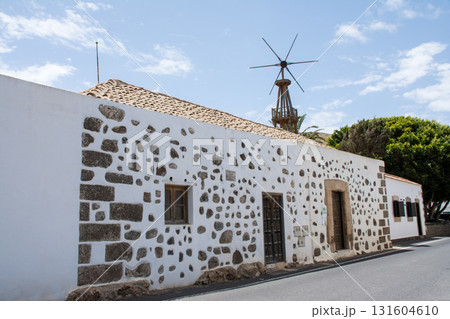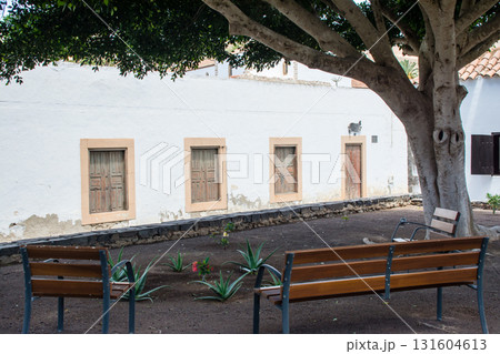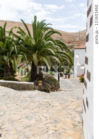 明るい日差しの中の石造りと白壁の建物の並ぶ街並み フエルテベンテュラ島のベタンクリアにて