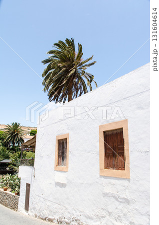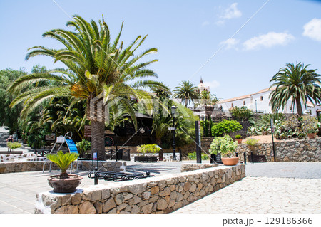 明るい日差しの中の白壁の建物と大きなヤシの木のある街並み フエルテベンテュラ島のベタンクリアにて
