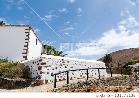 明るい日差しの白壁でできた歴史的な教会 カナリア諸島のフエルテベンテュラ島の内陸のベタンクリアにて