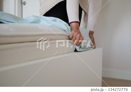 Person putting on a light blue bed cover in a bedroom