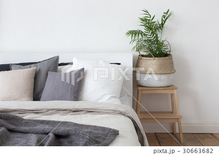 Bedroom interior bed and bedside table with plant