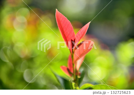 光を透過し鮮やかに輝くベニカナメモチの新芽