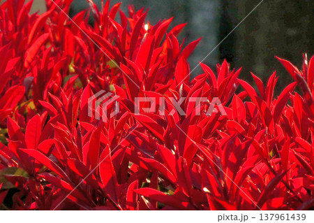 ベニカナメモチの鮮やかな赤い葉・春の背景素材