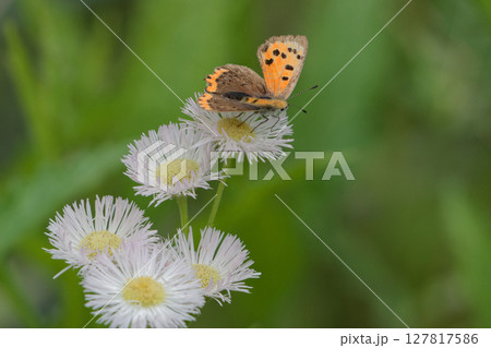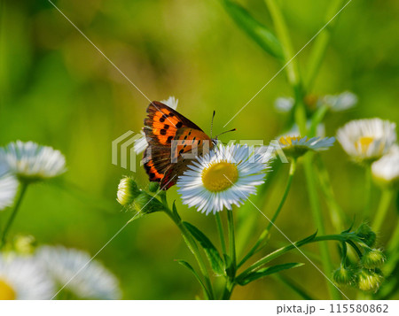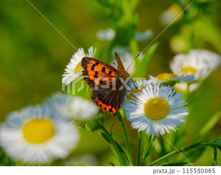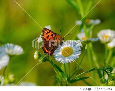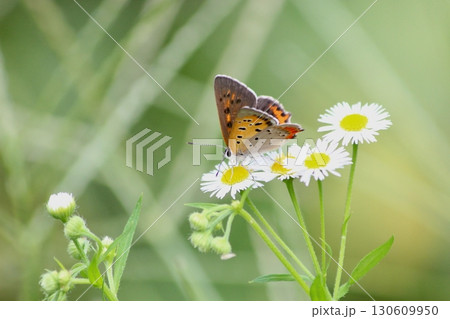 ヒメジョオンの花の上で蜜を吸ったり休んだりしているベニシジミ