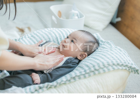 乳児のローションを塗る母親