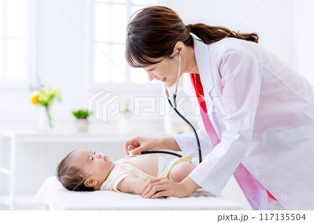診察を受ける笑顔の赤ちゃん 聴診 健診 乳幼児健康診査