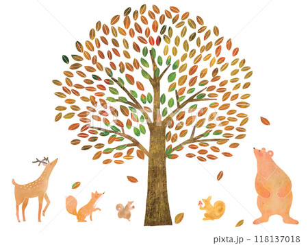 大きな木ー北欧風オシャレな秋の植物や森の動物の白バックベクターフレームのイラスト