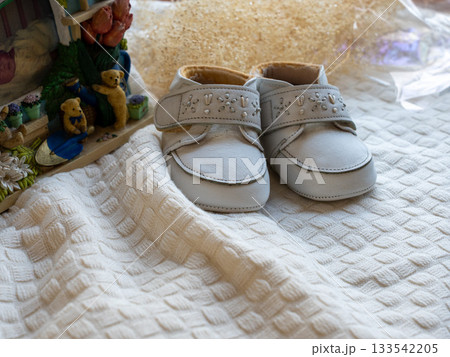 フォトフレームの前に置かれたベビーシューズ