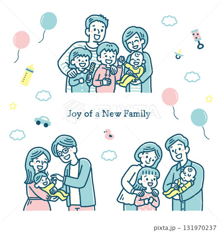 5人家族 赤ちゃん 兄姉 見守る 笑顔 シンプルカラー ベクター イラスト
