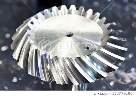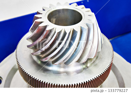 Close up scene the helical gear parts spare parts in the light blue scene.