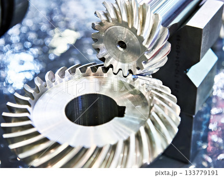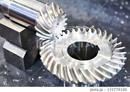 Close up the transmission bevel gear spare parts in the light blue scene.