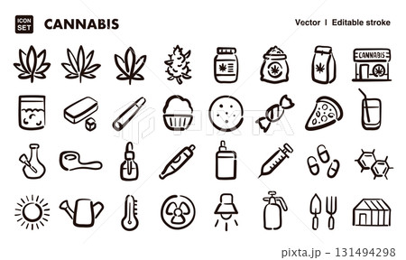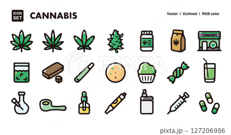 大麻、マリファナ製品のアイコンイラストセット グッズや食品、CBD関連のベクター素材