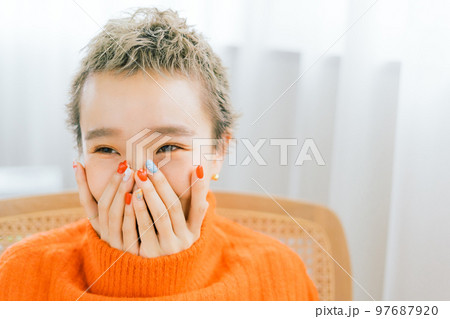 お洒落なベリーショートの女性(茶髪・笑顔)