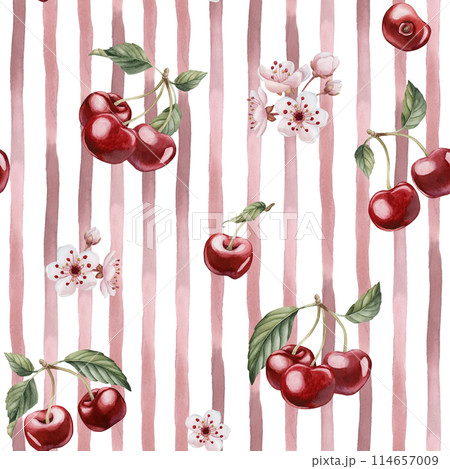 Cherry berries with flowers and leaves, watercolor red striped seamless pattern on white background with spring blossom for table textile, summer fabrics, prints, wrapping paper and food packages