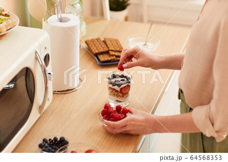Woman Making Cup Dessert in Kitchen