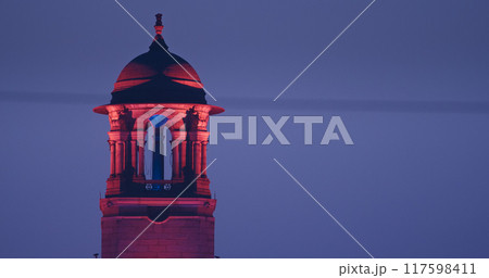 New Delhi, Delhi, India. Close up of Rashtrapati Bhavan, Bell tower in Kartavya Path, Rajpath Area. Rashtrapati Bhavan in evening night illumination lights lighting. Popular Public Space For Tourists