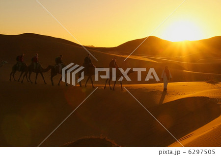サハラ砂漠の夕日と舞い落ちる砂