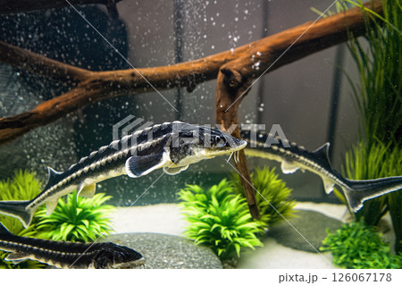 Sturgeons or sterlets swim in an aquarium as decoration for fish restaurant.