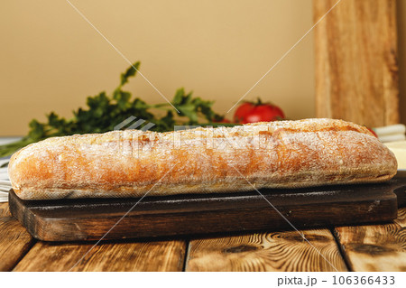 Italian ciabatta bread or bun in a box on the grey background. Freshly baked traditional bread