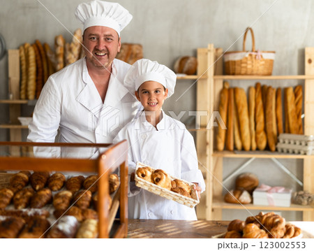Young daughter helps her father place hot croissants on bakery display. Family business