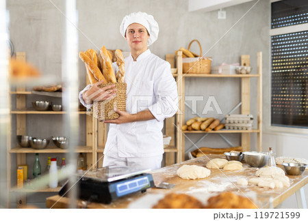 Happy male baker posing with basket of freshly baked baguettes in bakery, demonstrating concept of food industry and baker profession